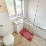 A modern three piece white bathroom suite comprising of a panel bath with mixer taps, electric shower above with shower glass screen, low level WC, wash hand basin with storage cupboard beneath, chrome towel radiator, part tiled walls, extractor unit, ceiling point and UPVC double glazed front window.
