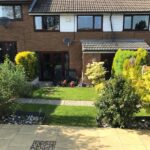Front: Block paved driveway for several cars, flagged patio garden with fence panel surround and gated access.