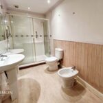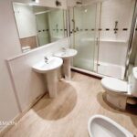A five piece white suite comprising of a walk-in shower unit, low level WC, two wash hand basins, bidet, chrome towel radiator, part tiled walls, wall lights, extractor unit, ceiling coving and ceiling spotlights.