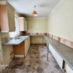 A range of wall and units with complementary worksurface, combi boiler, part tiled walls, radiator, single bowl sink unit with drainer, plumbed for washing machine, ceiling coving, ceiling point, UPVC double glazed side window and timber framed stable back door.