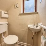 A two-piece white suite comprising of a low-level WC, wash hand basin, alarm pad, ceiling point and double glazed side window.