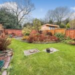 Rear: A flagged patio area, well kept lawn area, borders and shrubs, outside water tap, pebble patio area, wooden shed, fence panel and brick surround.