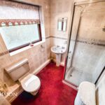 A three-piece suite comprising of a walk-in shower unit with electric shower, low level WC, wash hand basin, radiator, fully tiled walls, ceiling point and double glazed rear window.
