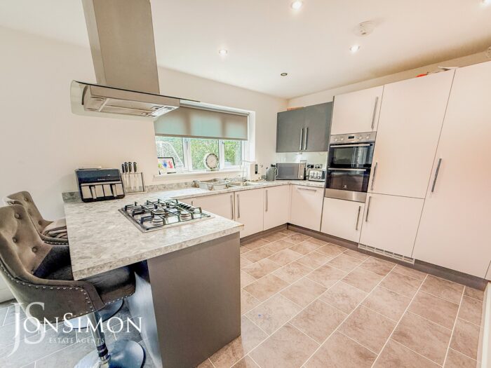 A modern range of wall and base units with complimentary worksurface, one and a half bowl sink unit with drainer, five ring gas hob with extractor unit above, integrated fridge, freezer, dishwasher, washing machine and double electric oven, tile effect flooring, ceiling spotlights, radiators, ceiling points, UPVC double glazed rear windows and UPVC double glazed French patio doors.