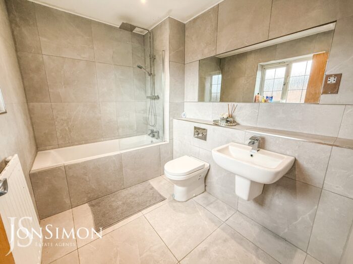 A modern three-piece white suite comprising of a shower above, glass shower screen, wash hand basin, low level WC, fully tiled walls, wall mounted mirror, radiator, ceiling spotlights and UPVC double glazed front window.