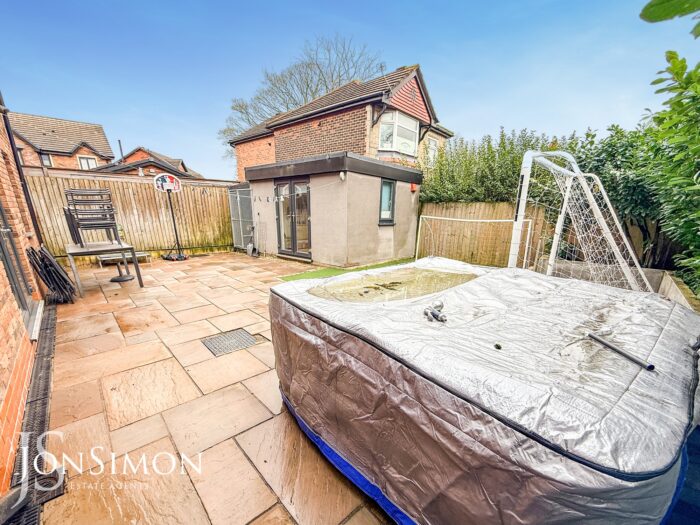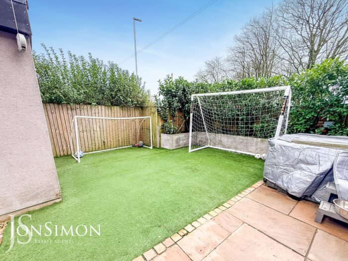 Rear: Indian paved patio area, Astro Turf lawn, dog kennel, borders and shrubs. Gated access to the side.