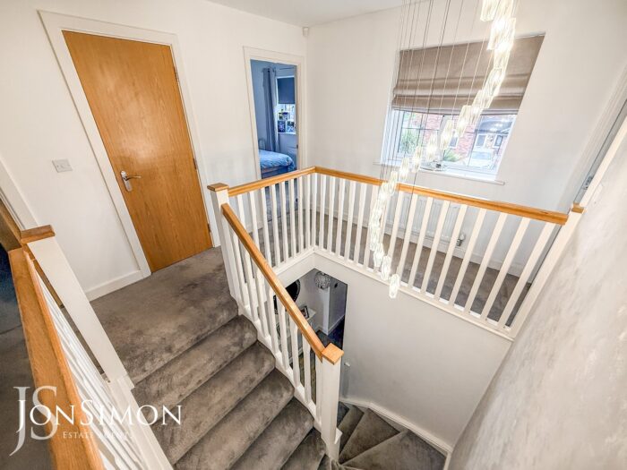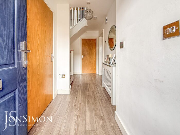 Composite double glazed front door, radiator, ceiling point, storage cupboard under the stairs and stairs leading to the first floor landing.