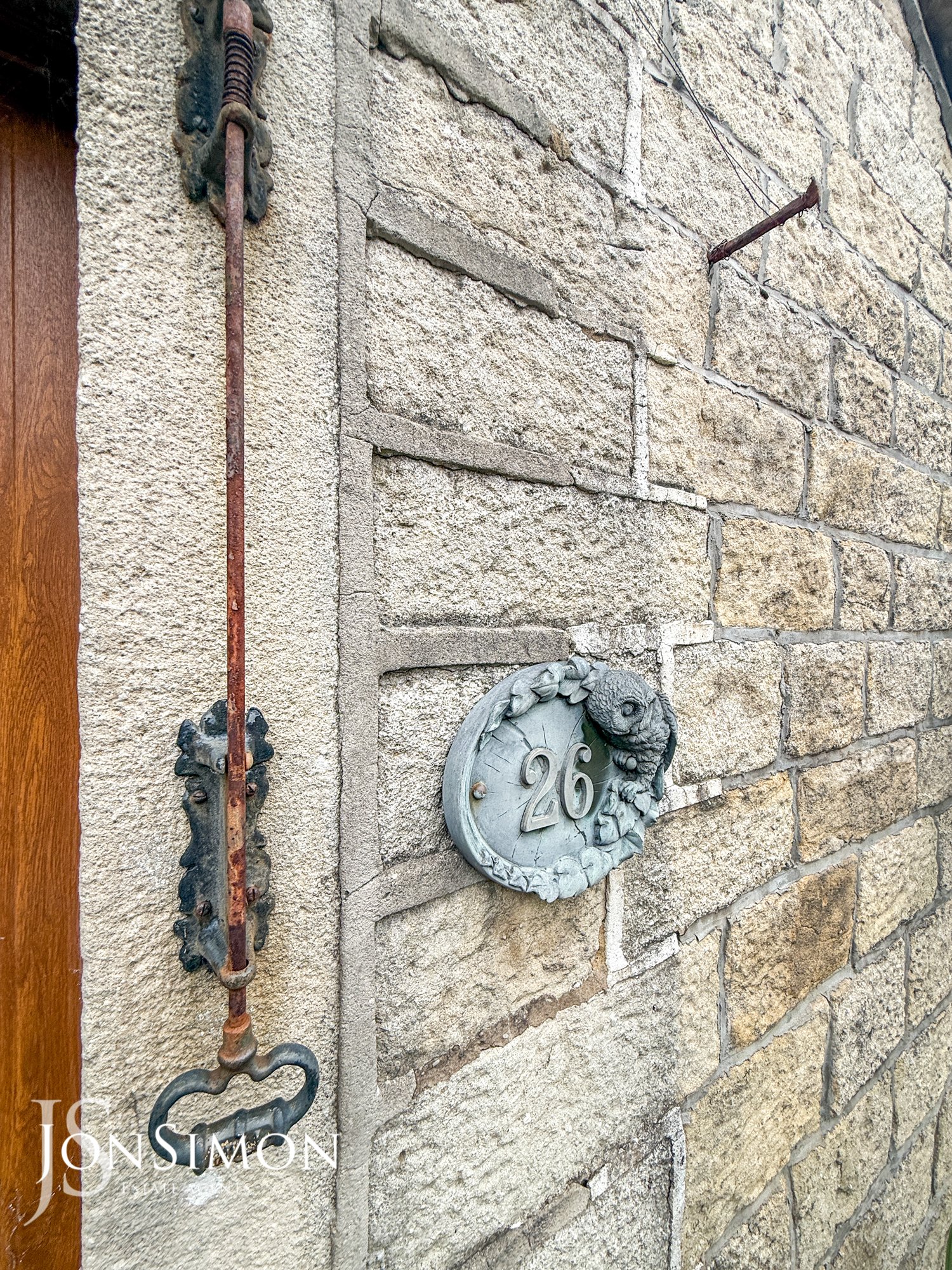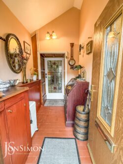 A composite double glazed front door, UPVC double glazed side window, tiled flooring, gas and electric meter cupboard and wall light.