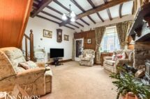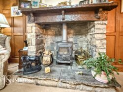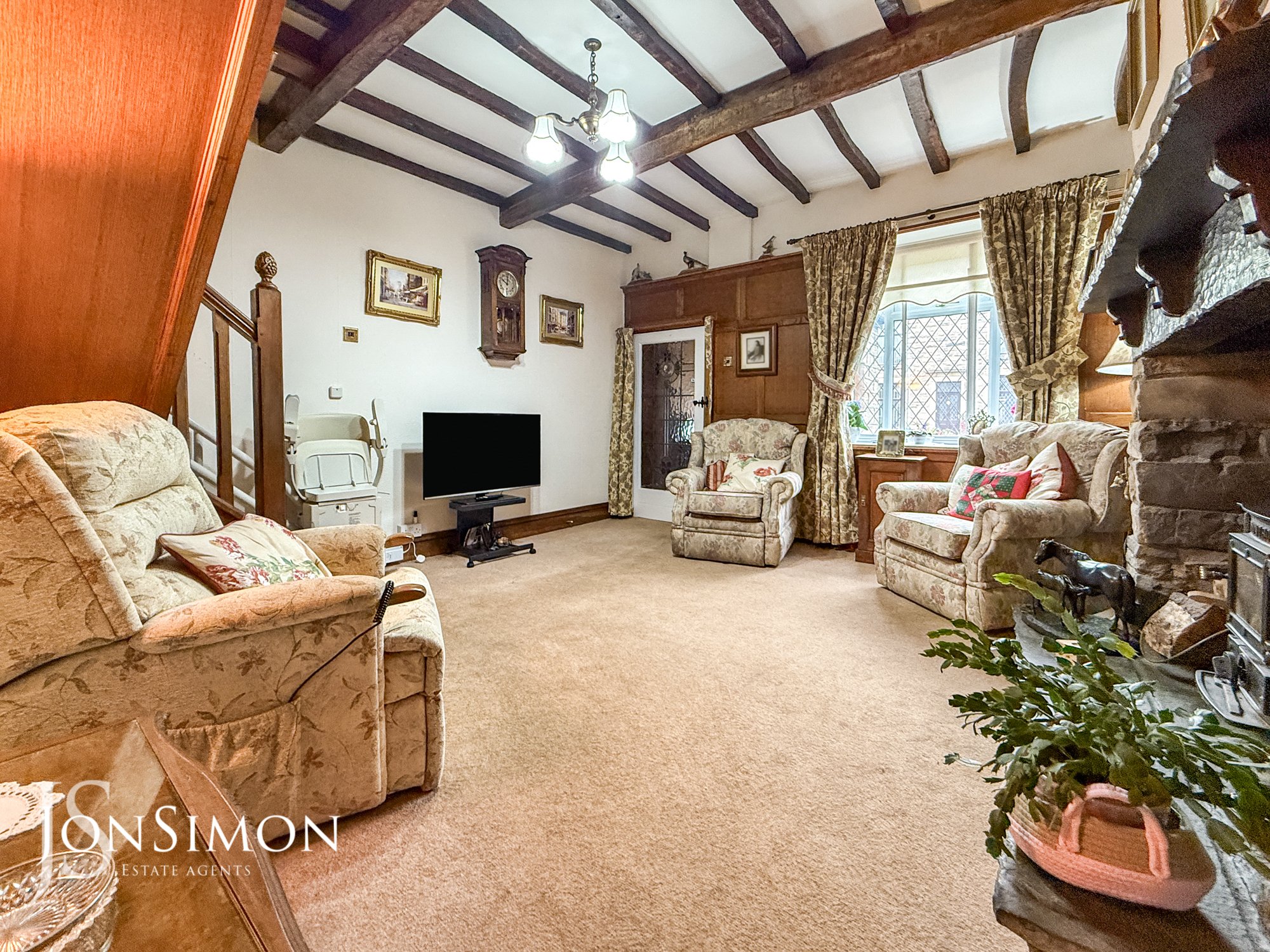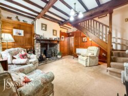 UPVC double glazed front window and secondary glazing, wood burning stove with feature stone fireplace, radiator, wood panel walls, TV point, ceiling beams, ceiling point and oak stairs leading to the first floor landing.
