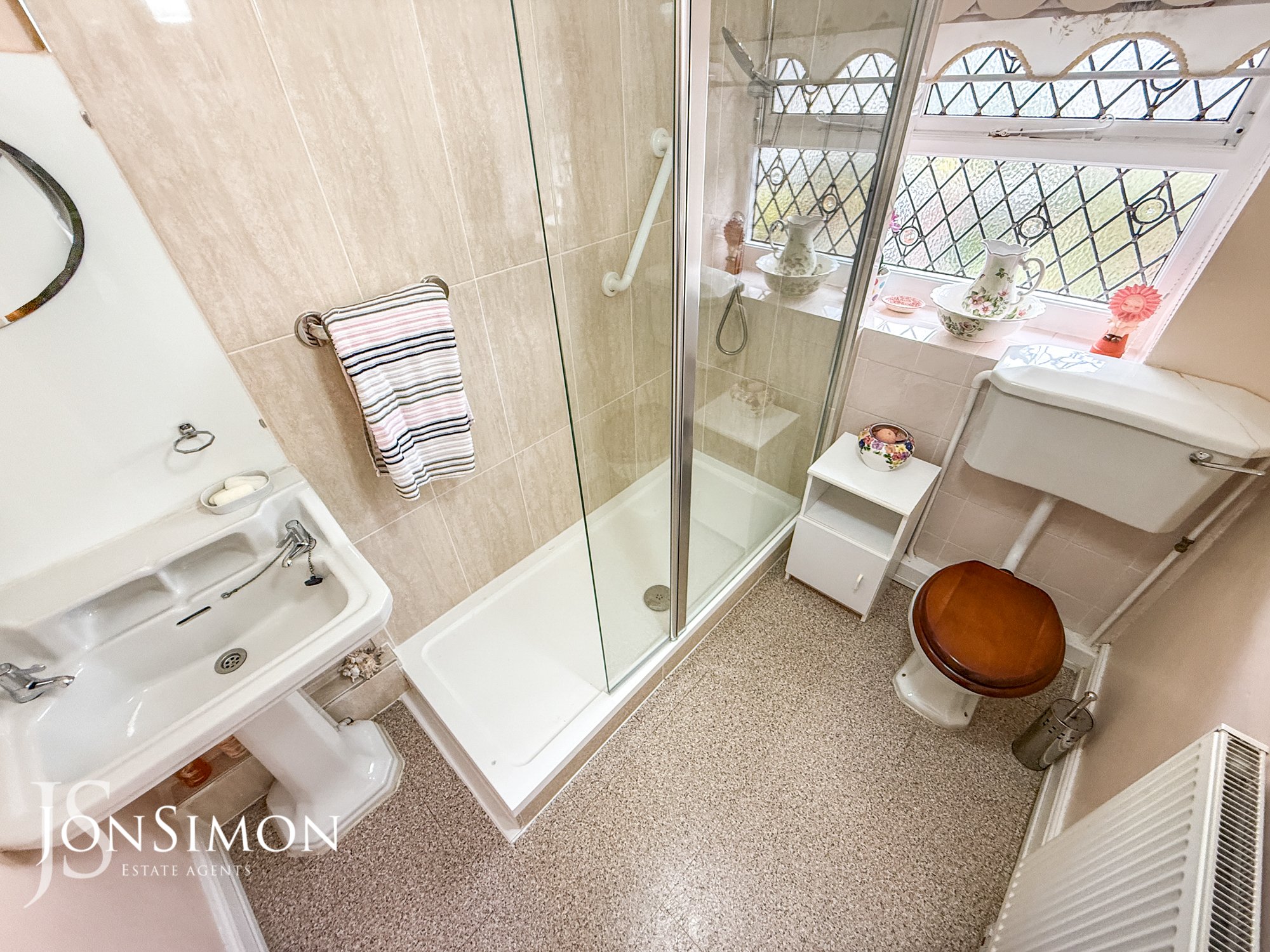 A three piece suite comprising of a large walk-in shower unit, low level WC, wash hand basin, part tiled walls, radiator, ceiling point and rear window.