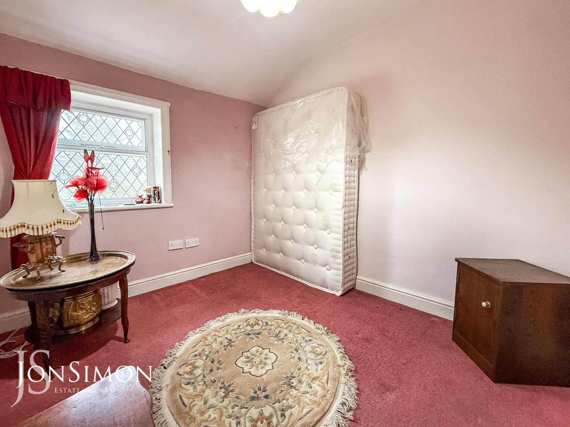 Rear window, radiator, storage cupboard, loft access and ceiling point.