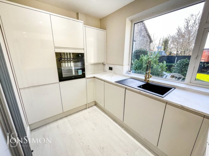 A modern range of wall and base units with complementary works surface, single bowl sink unit with drainer, four ring electric hob with feature extractor unit above, integrated fridge, freezer and washing machine, electric oven, combi boiler, radiators, laminate flooring, ceiling spotlight, UPVC double glazed rear window and UPVC double glazed French patio doors.