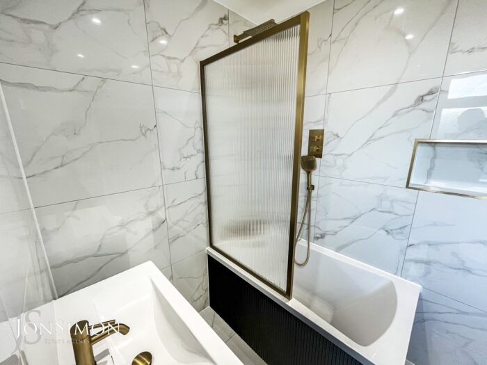 A brand new three-piece white suite comprising of a panel bath with mixer tap, shower above and separate showerhead, glass shower screen, low-level WC, wash hand basin with storage cupboard underneath, radiator, fully tiled walls and flooring, ceiling spotlights and UPVC double glazed side window.