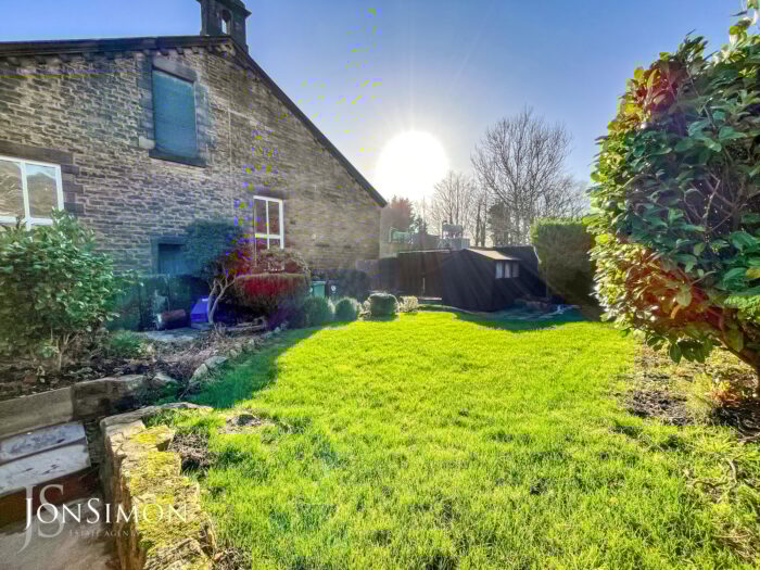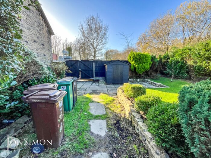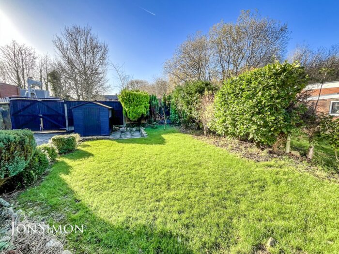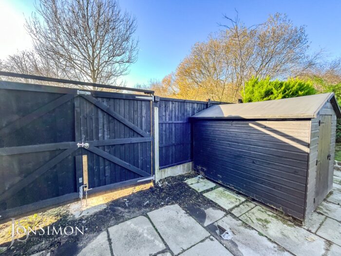 Rear: A large flagged paved patio area, lawn area, borders and shrubs, outside water tap, wooden shed, double gates leading to additional flagged driveway - ideal for trailers and caravans, fence panels surround and external lighting.