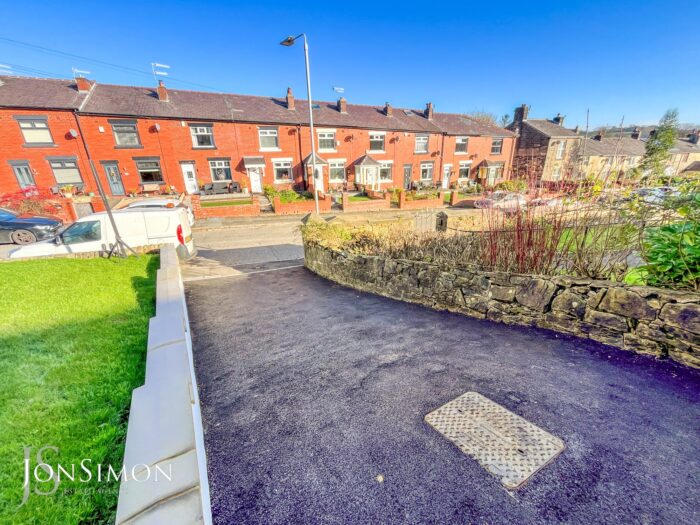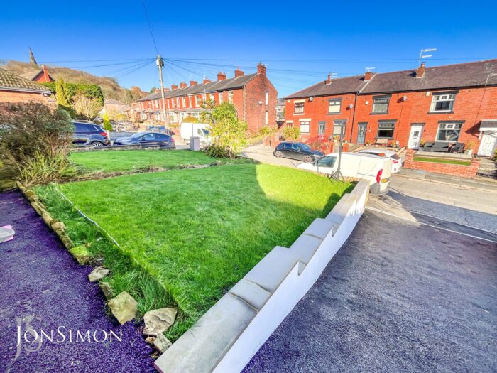 Front: A tarmac driveway providing ample off road parking, lawn area with borders and shrubs.