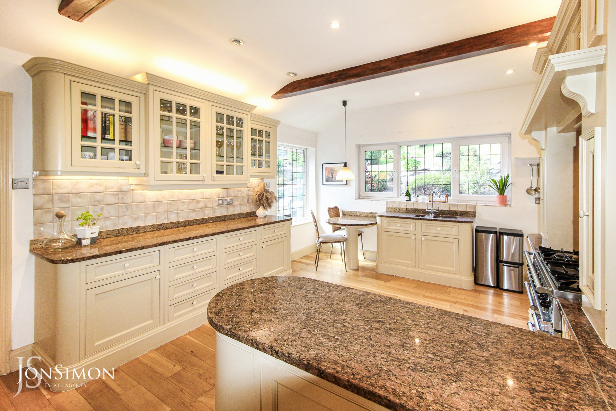 5.22m(17'2'') x 3.84m(12'7'') A generous bespoke fitted kitchen, well equipped with integrated appliances, including a 'Falcon' range cooker, 'granite' worksurfaces, inset one-and-a-half bowl sink, breakfast bar, part tiled walls, overlaid oak flooring, recessed lighting, windows on two elevations, beamed ceiling.