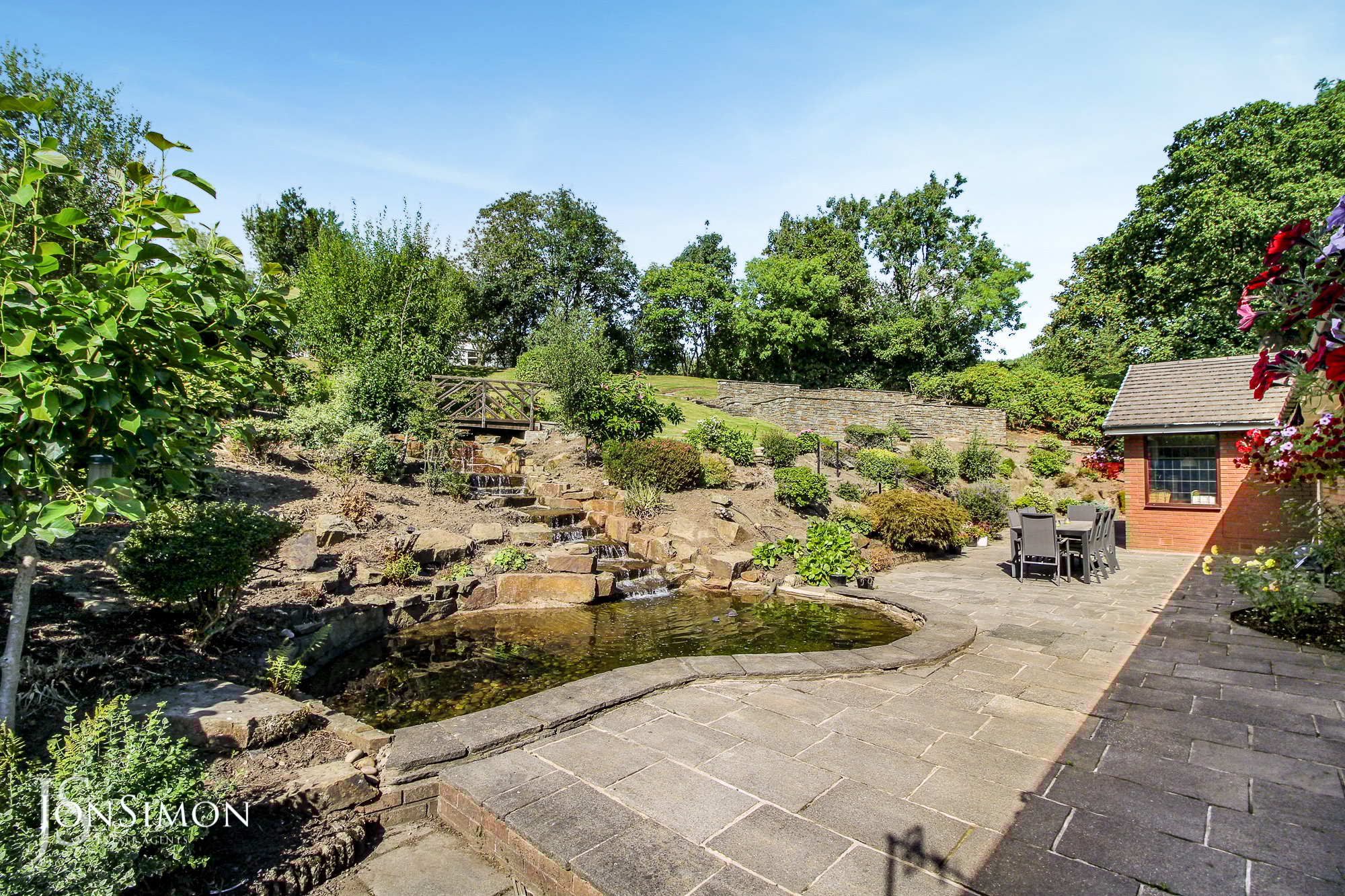 Set on 1.5 acres of beautifully maintained gardens, the property features manicured lawns, mature trees, shrubs, and colorful bedding plants. A stunning waterfall feature is nestled within a Japanese-style garden, complete with a wooden bridge, adding to the peaceful ambiance. The sweeping driveway complements the elegance and grandeur of Woodside.