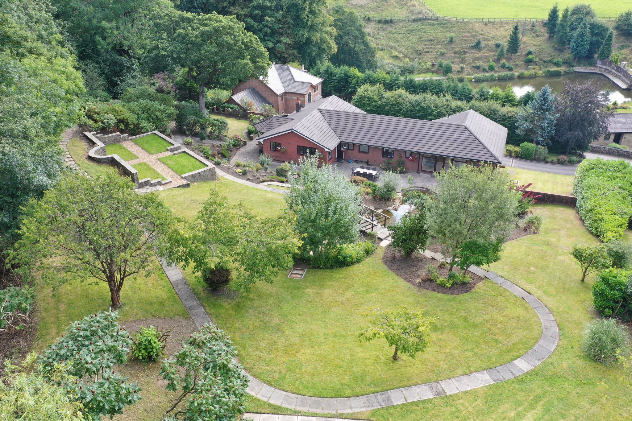 Mature, generously stocked gardens comprising rolling lawns, specimen shrub beds and borders, rose garden, waterfall water feature.
