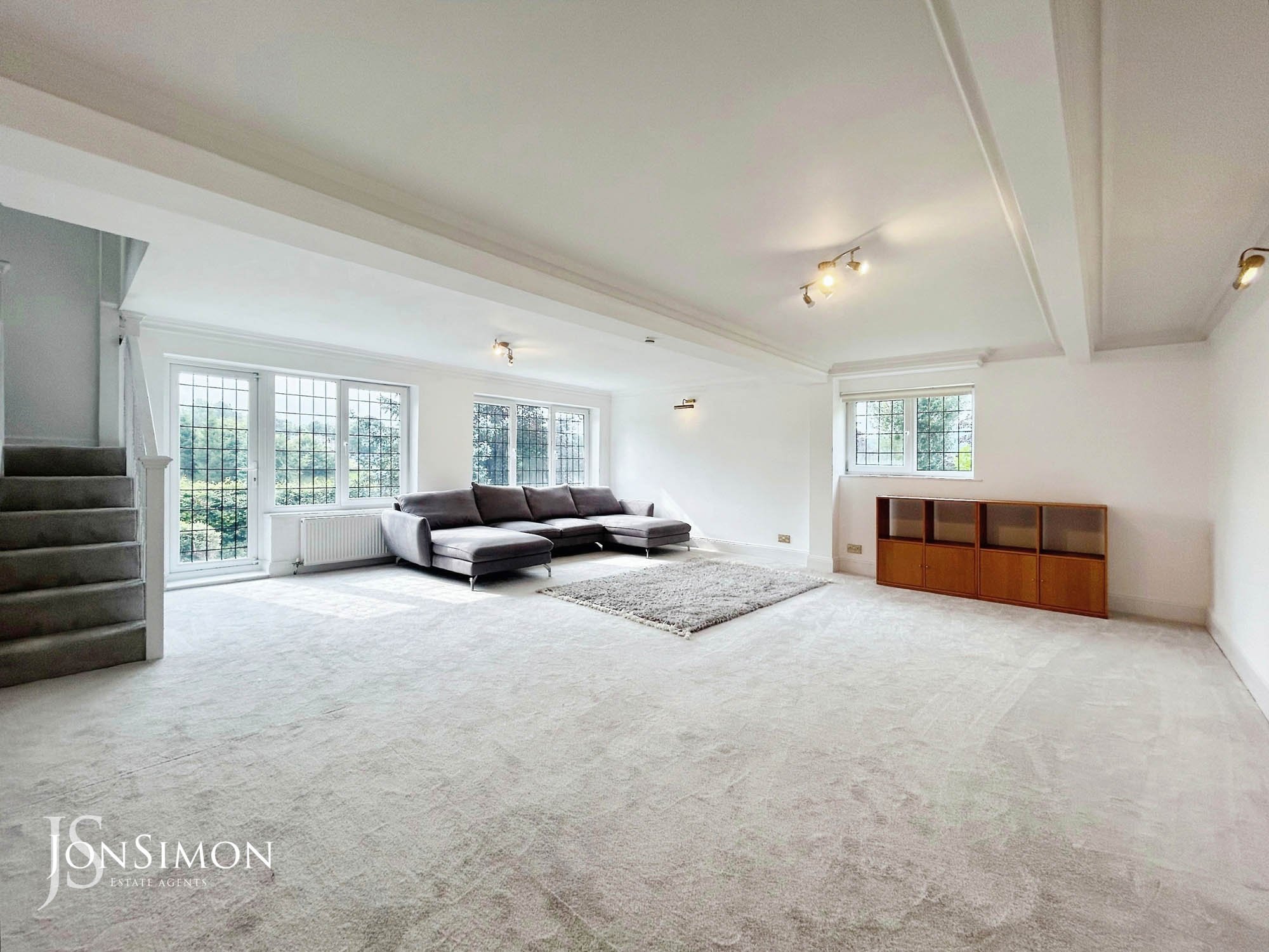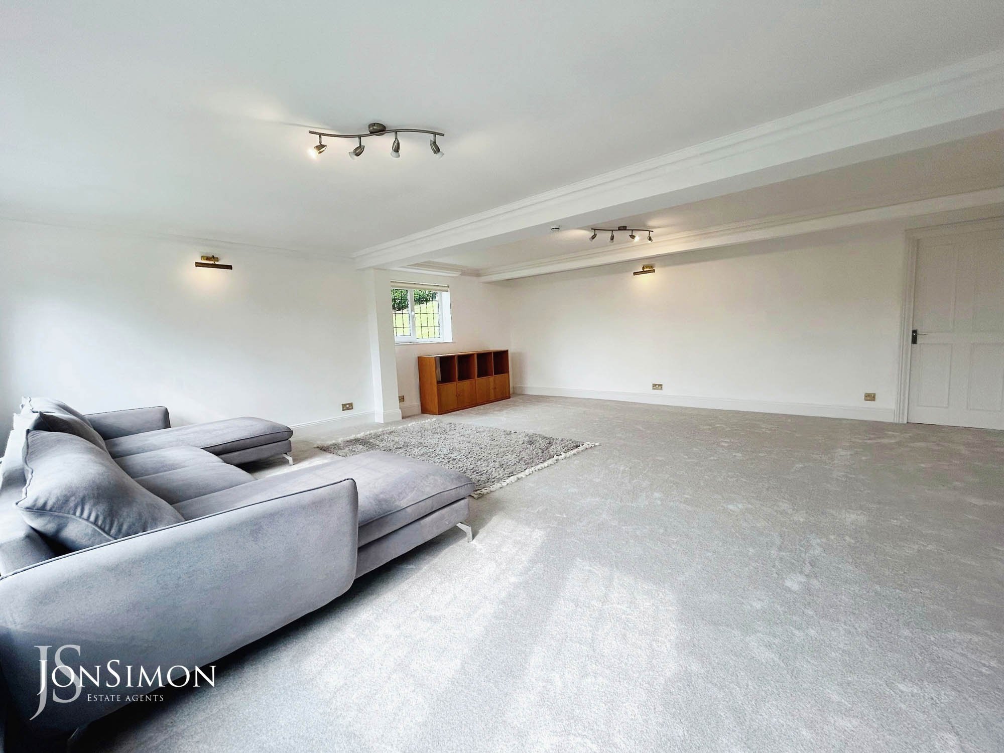 At the end of the main hallway, a bright and airy sunroom offers patio access to the garden. This versatile space is perfect for enjoying a morning coffee, reading a book, or even serving as an office. A second stairway leads downstairs to a reception room with ground-level access, which could function as a playroom, an additional lounge, or extra storage space. The property also includes a double garage with extra workshop or storage space, accessible by stairs leading up to the main entrance hallway.
