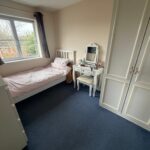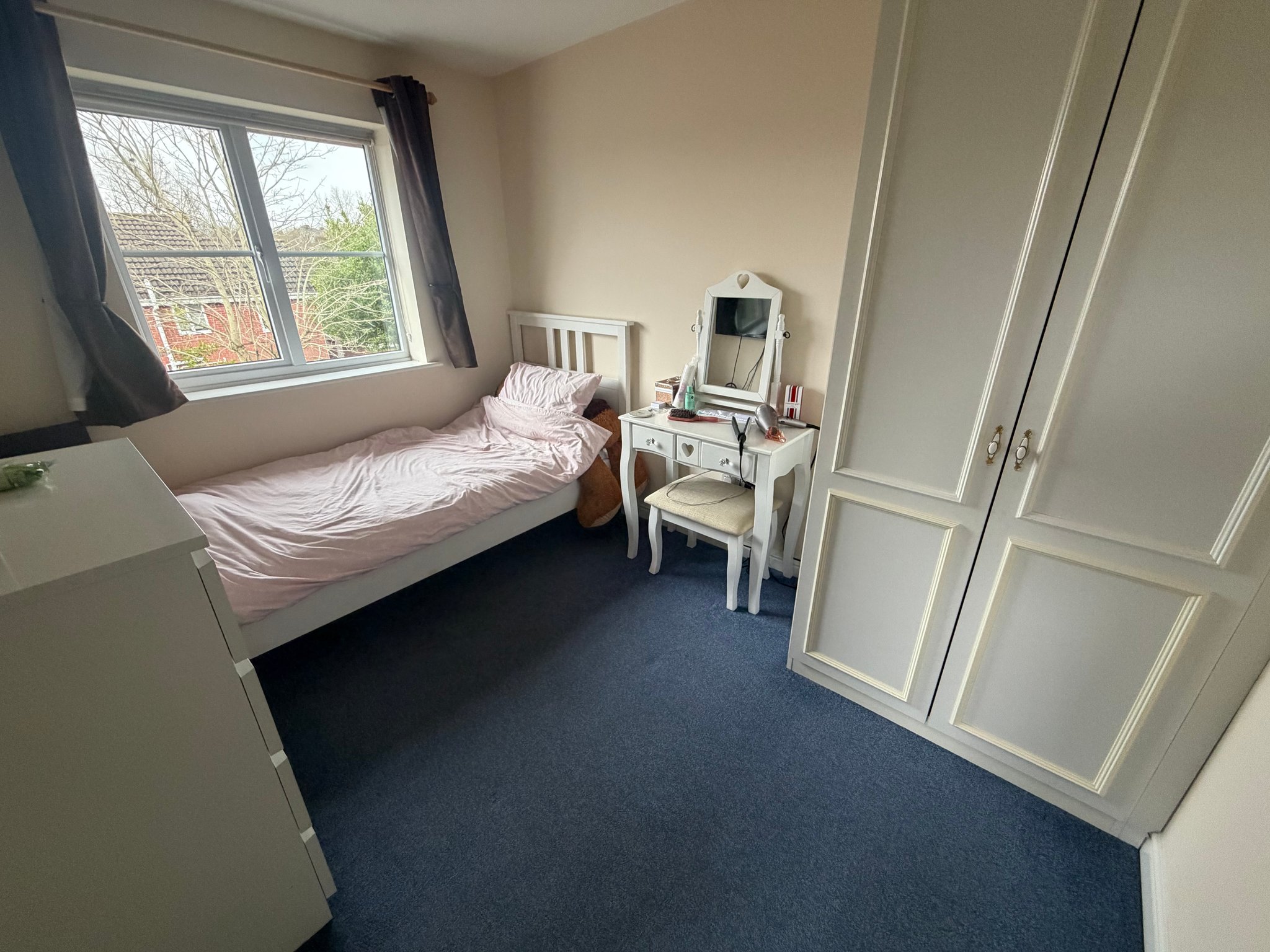 Well-proportioned third bedroom, ideal as a child’s room, nursery, or home office, with laminate flooring and a useful bulkhead storage cupboard.