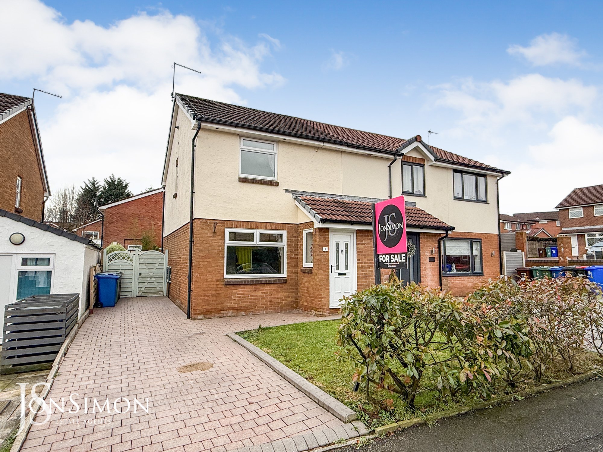Front: A large block paved driveway for several cars, lawn area and well maintained borders and shrubs.