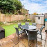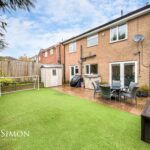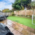 Rear: A large paved patio area, Astroturf lawn area, borders and shrubs, fence panels surround, outside water taps and gated access to the side.