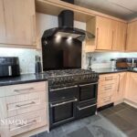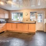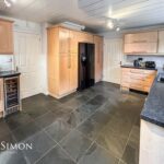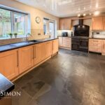 A modern kitchen with a range of wall base units with complementary worksurface, one and a half bowl sink unit with drainer, part tiled walls, tiled flooring, integrated American style fridge and freezer, dishwasher, washing machine, wine cooler, gas range cooker with eight ring gas hob, extractor unit above, electric floor heaters, ceiling points, UPVC double glazed rear windows and UPVC double glazed back door.