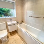 A modern three-piece white suite comprising a panel bath with mixer taps, shower above with glass shower screen, low level WC, wash hand basin with storage cupboards, towel radiator, fully tiled walls and flooring, ceiling spotlights and UPVC double glazed rear window.