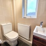 A modern two piece white suite comprising of a low level WC, wash hand basin with storage cupboard underneath, radiator, fully tiled walls and flooring, loft access, ceiling point and UPVC double glazed side window.