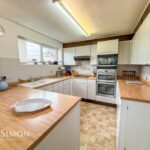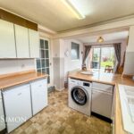 A fitted kitchen with a range of wall and base units with complementary worksurface, four ring electric hob with extractor above, integrated microwave, electric double oven, plumbed for washing machine, one and a half bowl sink unit with drainer, part tiled walls, radiator, ceiling points, UPVC double glazed side windows and UPVC double glazed sliding patio door.