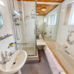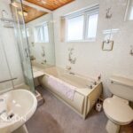 A four piece suite comprising of a panel bath with mixer tap, walk-in shower unit, low level WC, wash hand basin, fully tiled walls, radiator, ceiling point and two UPVC double glazed side windows.