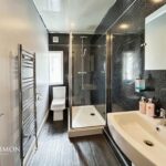 uPVC double glazed frosted window, fitted with a three piece suite, comprising of double shower, low level wc, hand wash basin, chrome heated towel rail and inset spots.