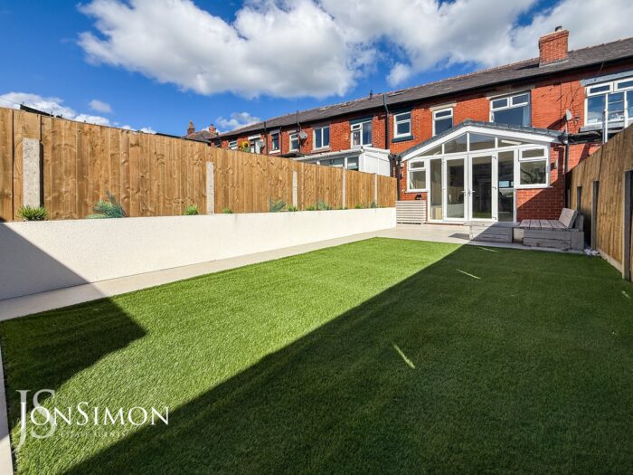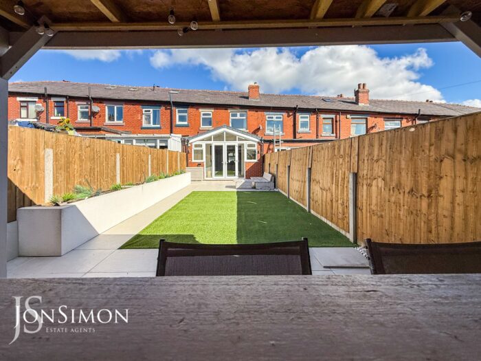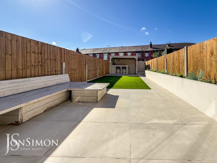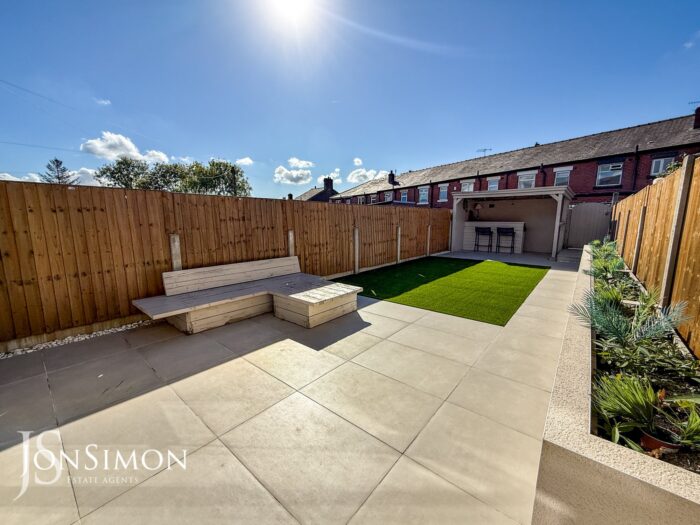 Rear: Large tiled patio area, Astroturf lawn, borders and shrubs, sheltered bar with power and ceiling points. Fence panels surround and gate access to the rear.