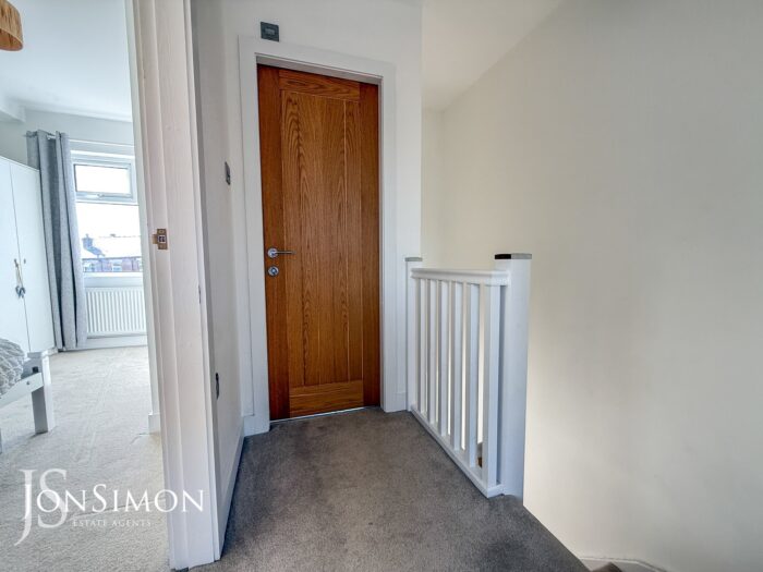 Spindled balustrade, loft access and ceiling point.