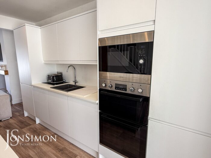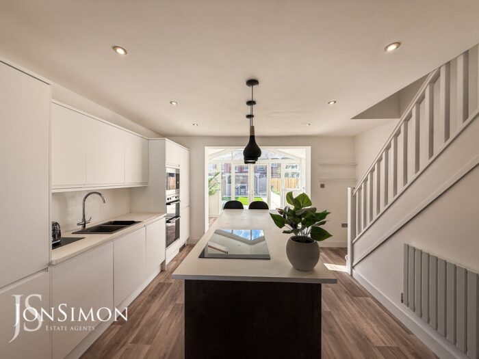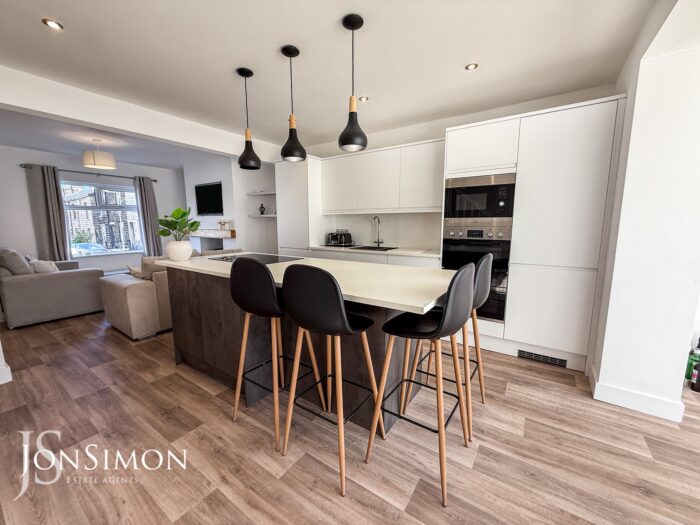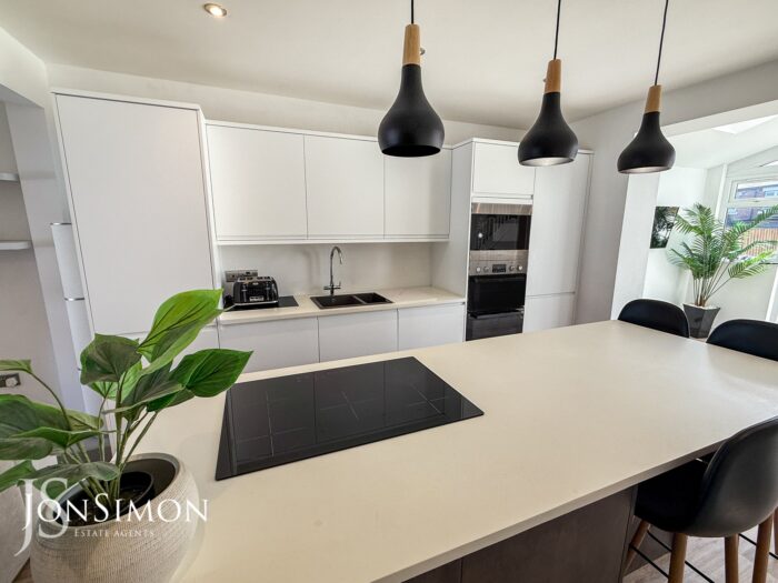 A contemporary fully fitted kitchen with a range of wall and base units with complementary work surfaces, five ring electric hob with feature lighting above, one and a half bowl sink unit with Hot water mixer tap, integrated fridge, freezer, dishwasher, microwave and double electric oven, breakfast bar, radiator, storage cupboard, wood effect flooring, ceiling spotlights and stairs leading to the first floor landing.