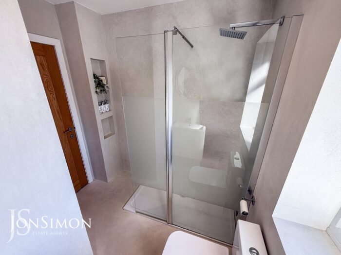A modern three-piece white suite comprising of a walk-in shower unit, low level WC, wash hand basin with storage cupboards underneath, chrome towel radiator, electric wall mounted mirror, extractor unit, ceiling spotlights and UPVC double glazed rear window.