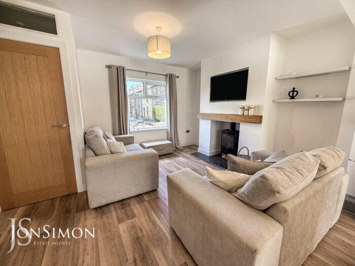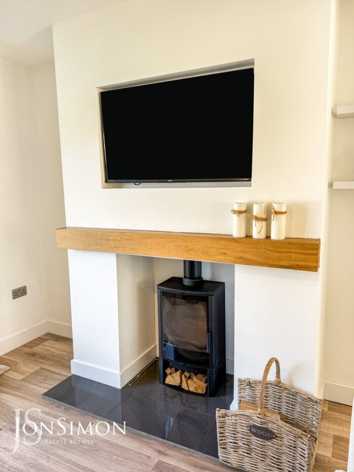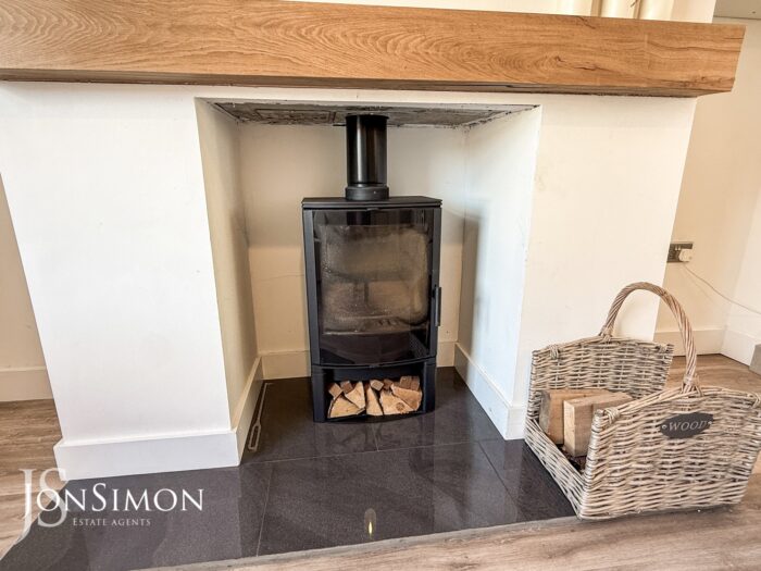 UPVC double glazed front window, feature log burning stove with fireplace, radiator, wood effect flooring and ceiling point.