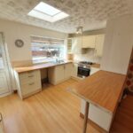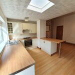 Range of wall and base units for complimentary worksurface, four ring gas hob with extractor unit above, electric oven, single bowl sink unit with drainer, breakfast bar, plumbed for washing machine, ceiling point, Velux window, UPVC double glazed rear window and back door.