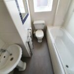 A modern three piece white comprising of a panel bath with mixer taps, shower above, glass shower screen, low level WC, wash hand basin, chrome towel radiator, fully tiled walls, ceiling point and UPVC double glazed rear window.