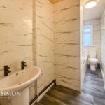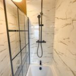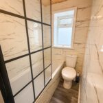 A modern brand-new three-piece white suite comprising of a panel bath with mixer tap, shower above and glass shower screen, low level WC, wash hand basin, radiator, loft access, ceiling point and UPVC double glazed rear window.