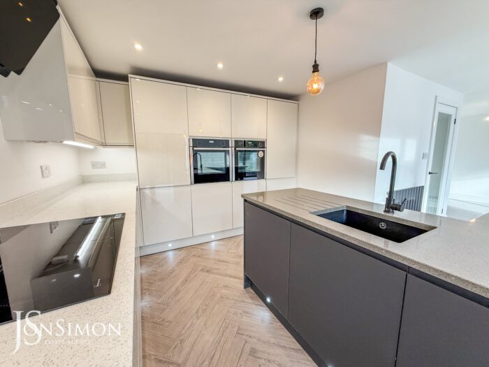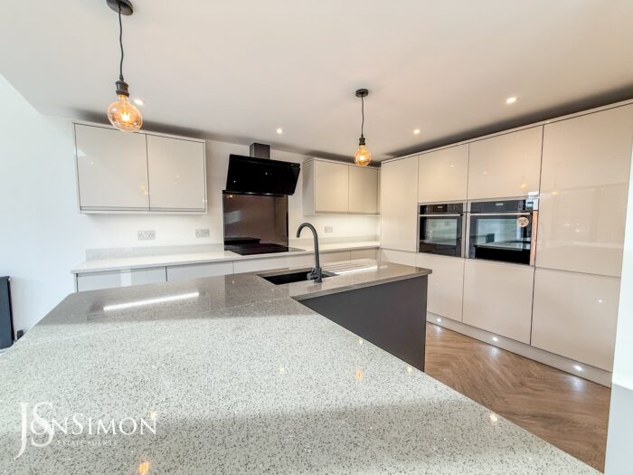 A brand new contemporary fitted kitchen with a large range of wall and base units with complementary quartz worksurface, two electric ovens, integrated fridge, freezer, dishwasher and washing machine, single bowl sink unit with drainer, five ring induction hob with extractor above, LED lighting, feature lighting, breakfast bar, radiator, ceiling spotlights and wood effect flooring.