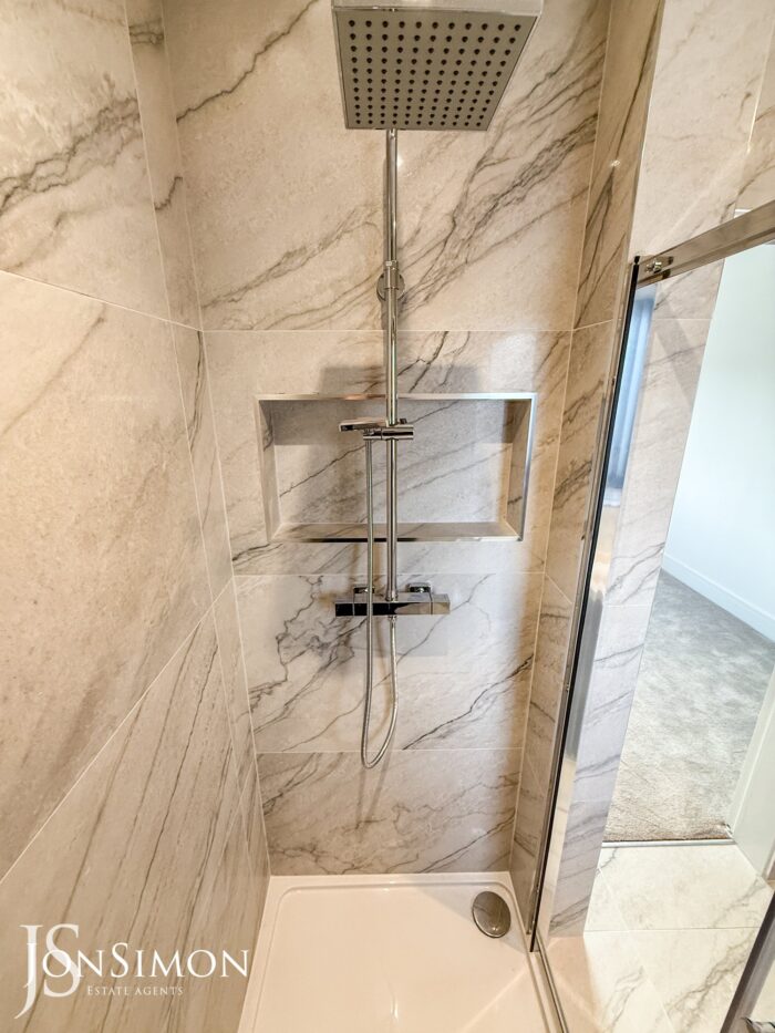 A brand new three-piece white suite comprising of a large walk-in shower unit, low level WC, wash hand basin with storage cupboard underneath, chrome towel radiator, fully tiled walls and flooring, extractor unit, ceiling spotlights and UPVC double glazed front window.