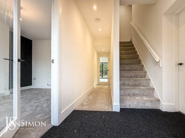 A composite front door, meter cupboards, ceiling spotlights and stairs leading to the first floor landing.