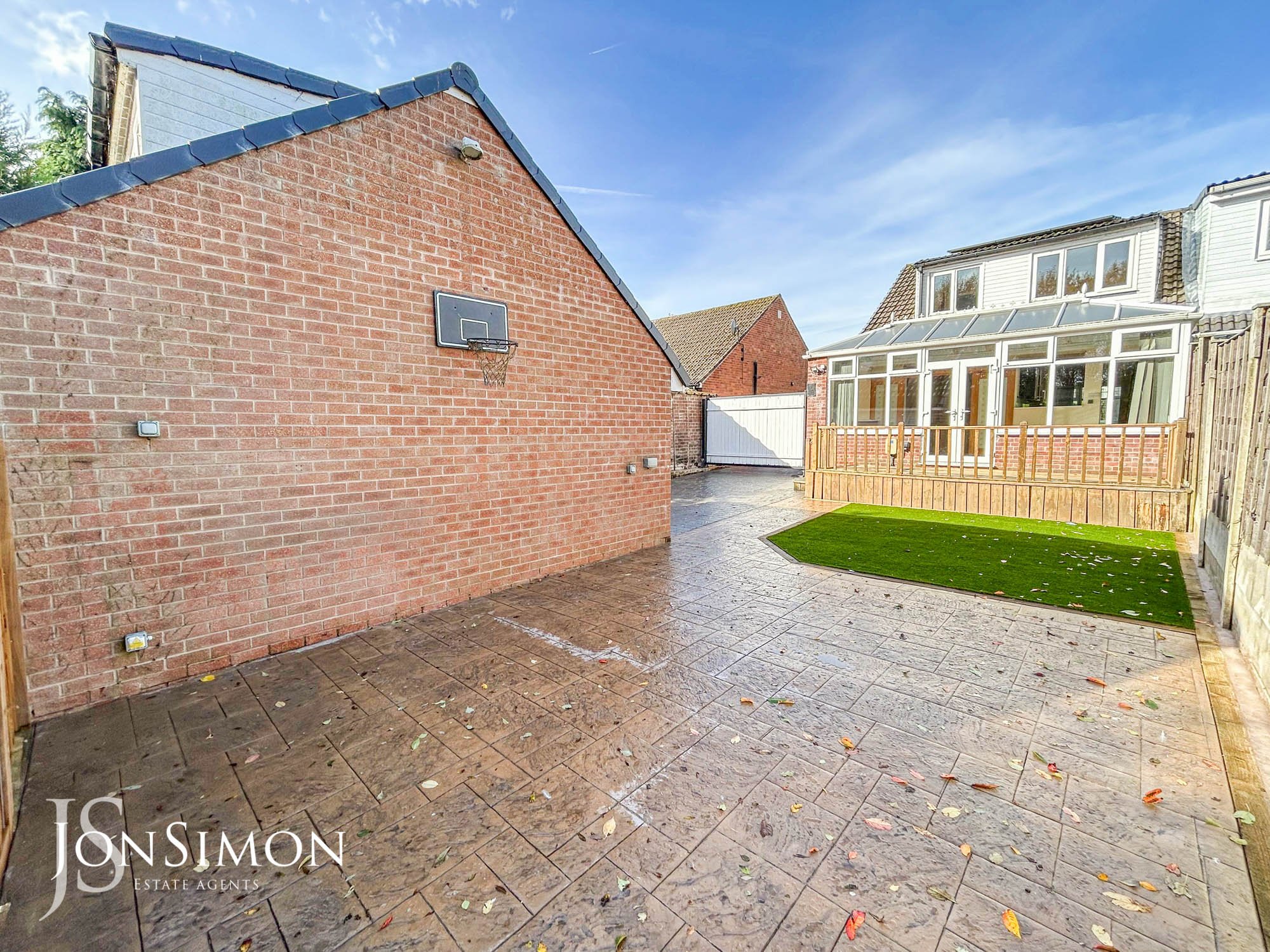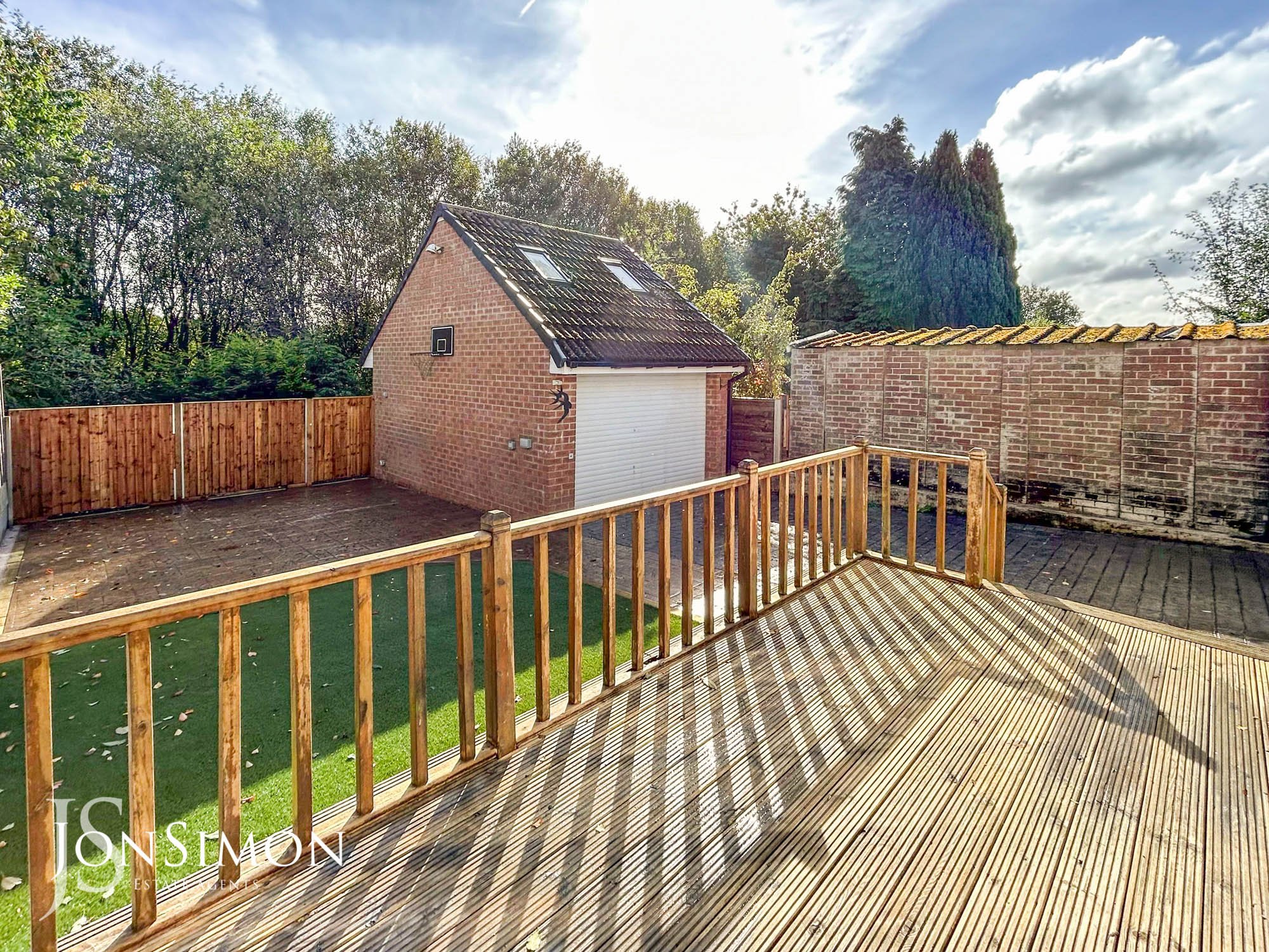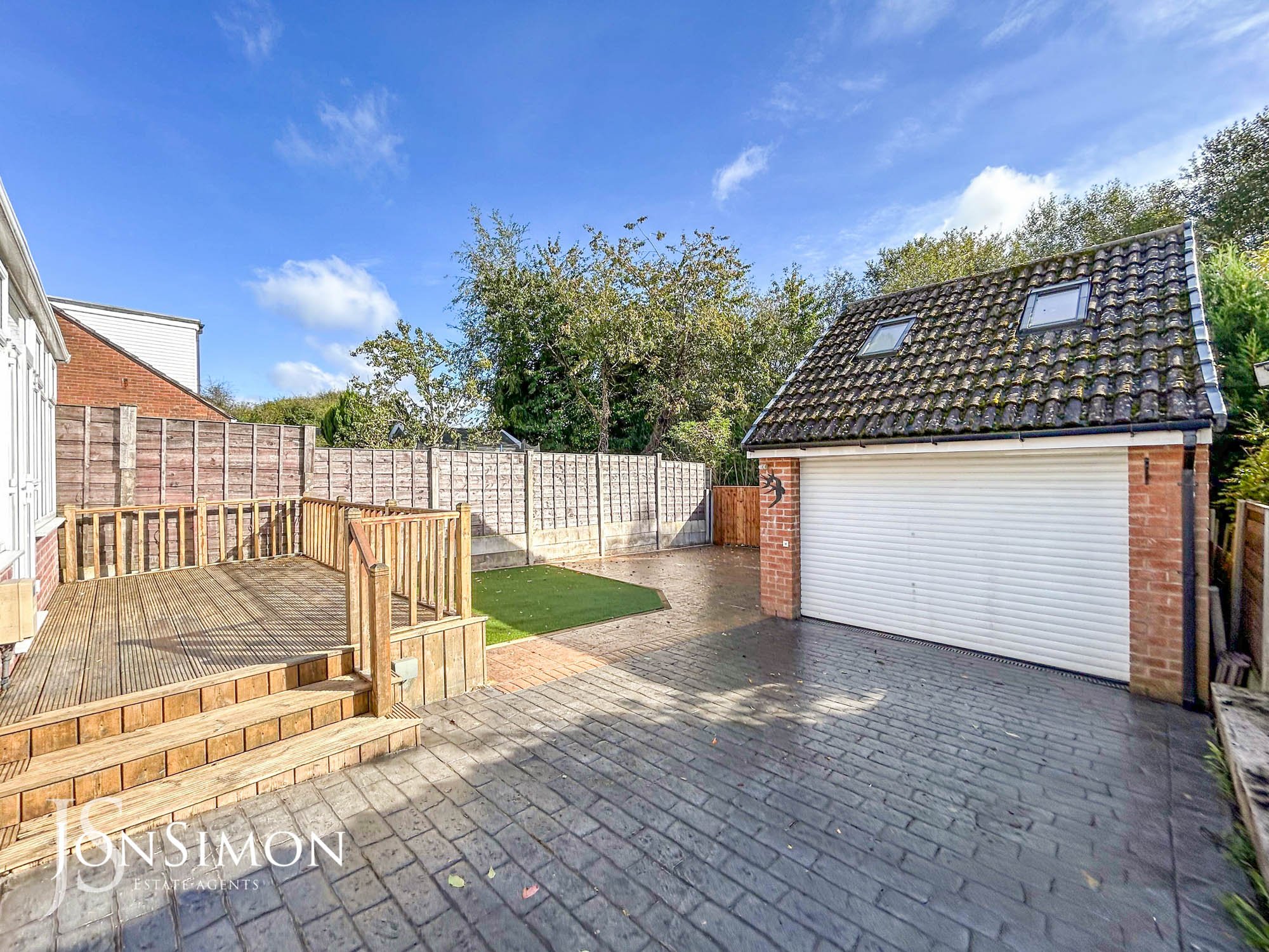 Rear: Well maintained decked patio area, external power point, Astro turf lawn, large concrete paved patio area and driveway, fence panel surround and electric remote controlled gated access to the rear.