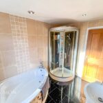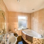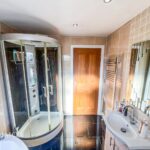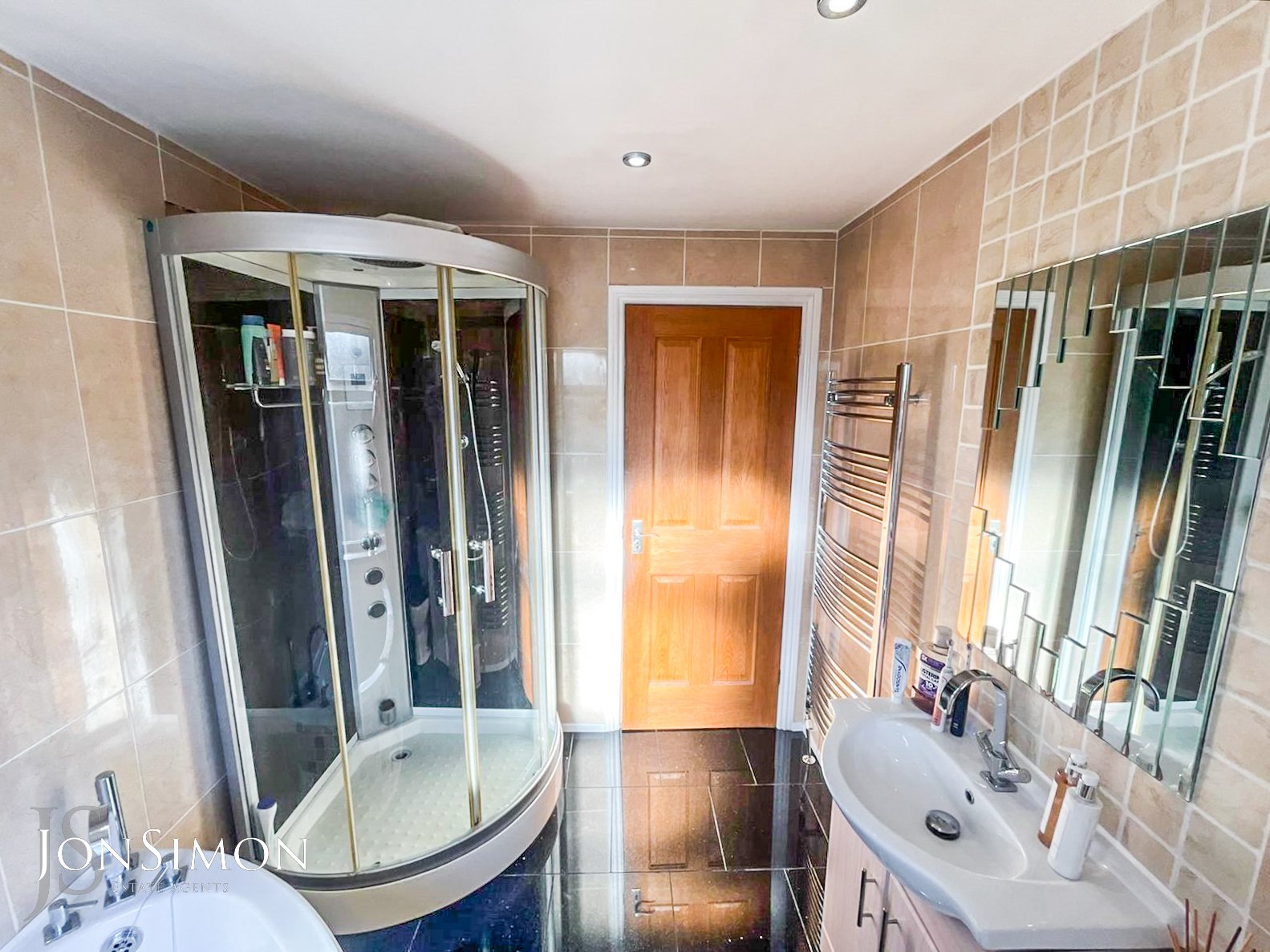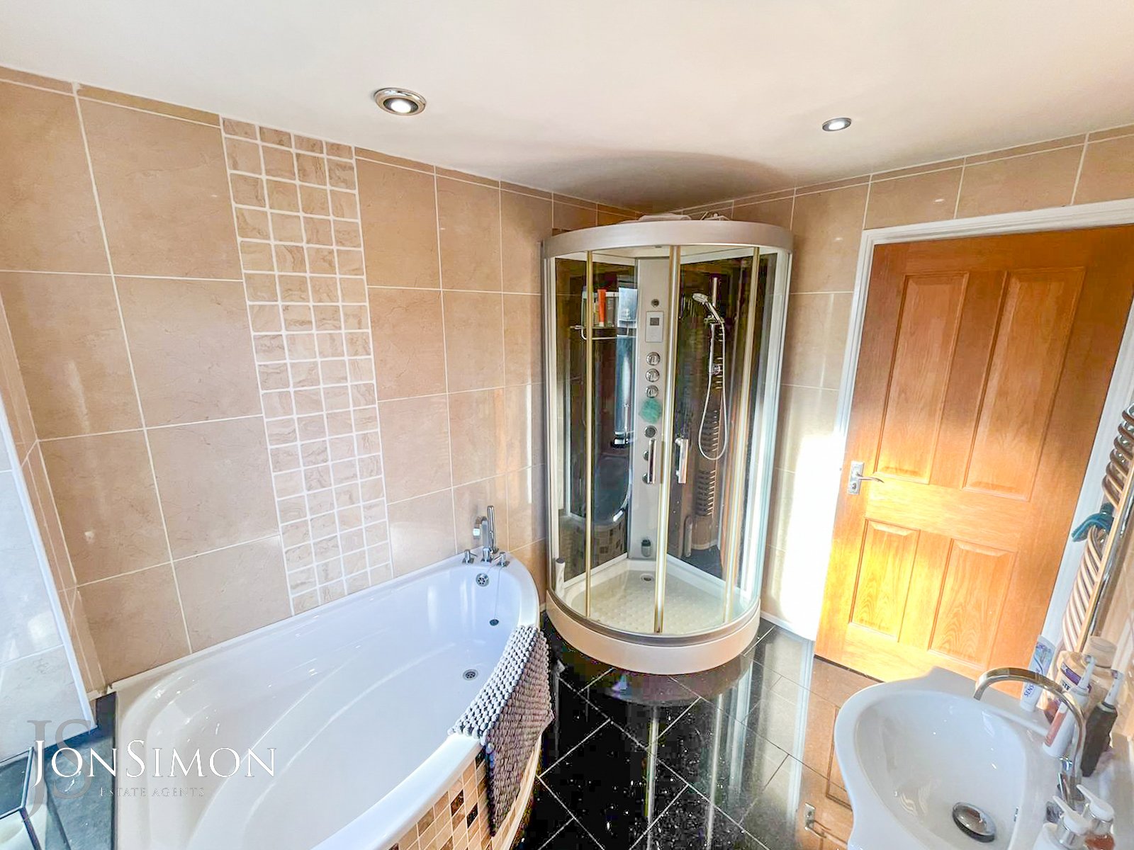 Double glazed frosted window to the rear, contemporary four piece white suite comprising of; Low level w.c, pedestal hand wash basin set in vanity unit, corner bath and walk in steam shower cubicle. Chrome heated towel rail, tile floor & elevations, spotlights and extractor fan.