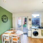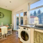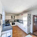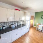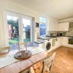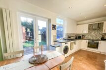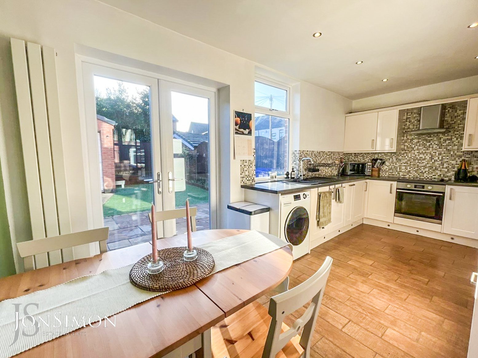 Double glazed window and French style doors to the rear, selection of high gloss wall & base units with work surfaces to complement, integrated fridge/freezer, electric oven & hob with stainless steel extractor hood over, plumbed for washing machine, one & half sink & drainer unit, tiled splash back, tiled floor, feature radiator, spotlights and built in storage housing wall mounted gas fired combination boiler.