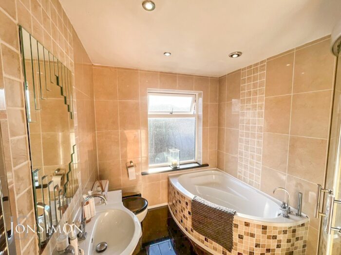 Double glazed frosted window to the rear, contemporary four piece white suite comprising of; Low level w.c, pedestal hand wash basin set in vanity unit, corner bath and walk in steam shower cubicle. Chrome heated towel rail, tile floor & elevations, spotlights and extractor fan.