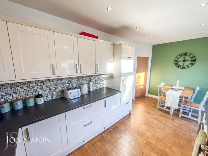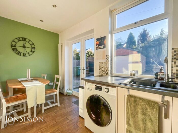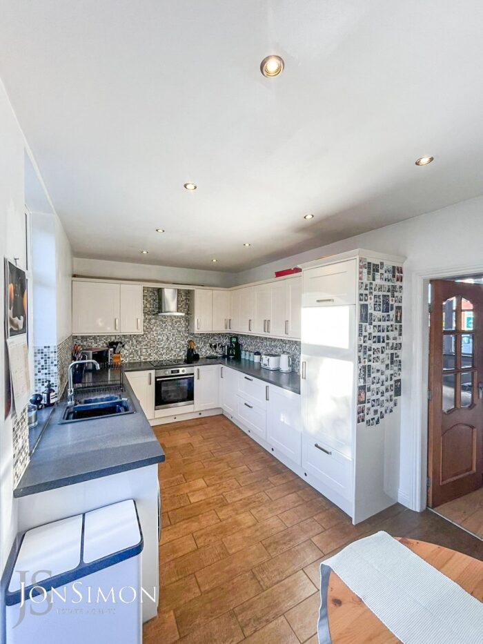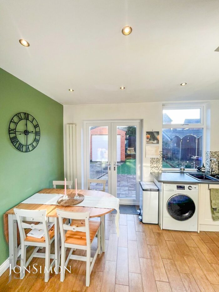 Double glazed window and French style doors to the rear, selection of high gloss wall & base units with work surfaces to complement, integrated fridge/freezer, electric oven & hob with stainless steel extractor hood over, plumbed for washing machine, one & half sink & drainer unit, tiled splash back, tiled floor, feature radiator, spotlights and built in storage housing wall mounted gas fired combination boiler.