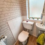 A two piece white suite comprising of a low level w/c, wash hand basin, part tiled walls, double glazed side window.