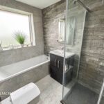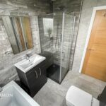 1.91 x 2.40 (6'3" x 7'10") - A four piece white suite comprising of a corner fitted shower unit, bath, WC, sink with cupboards below. Double glazed side window.